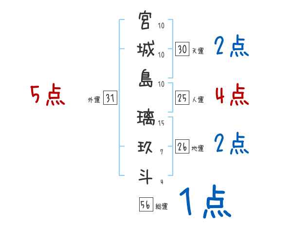 天運![]() | 宮城島璃玖斗さんの天運は30画の2つ星!浮き沈みの激しさに注意しましょう。 家系が持つ宿命的な運勢を表します。祖先から受け継いだ苗字ですので自分の力が及びません。家柄を象徴します。 |
