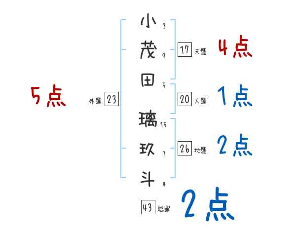 外運![]() | 小茂田璃玖斗さんの外運は23画の5つ星!想像力に優れ活力がある。一代で成功し名誉を手に入れる。 生活面を象徴する運勢です。外部から受ける影響力を表し、結婚運、家庭運や職場、環境への順応性を表します。 |