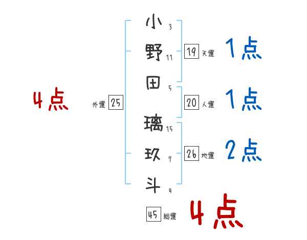 総運![]() | 小野田璃玖斗さんの総運は45画の4つ星!もくもくと物事を進め達成する。地味な努力家。 あなたの人生を表す1番重要な運勢です。生涯を通じて影響する総合運となり、主に50歳以降の晩年期に影響を及ぼします。 |