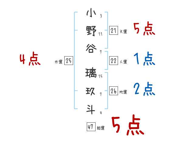 総運![]() | 小野谷璃玖斗さんの総運は47画の5つ星!実力が開花し発展する円満な人生。財に恵まれる。 あなたの人生を表す1番重要な運勢です。生涯を通じて影響する総合運となり、主に50歳以降の晩年期に影響を及ぼします。 |
