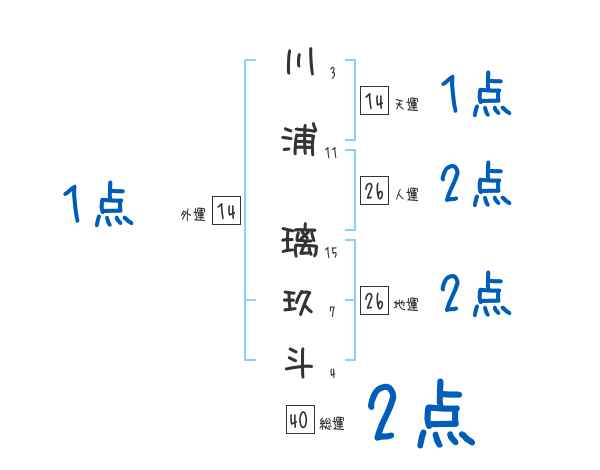 地運![]() | 川浦璃玖斗さんの地運は26画の2つ星!波瀾万丈かも。信頼できる人を大事にしましょう。 個性を表す基礎的な運勢です。性格形成や対人関係、行動力など家庭環境に影響されます。主に誕生してから20歳くらいまでの若年期の運勢を表します。 |