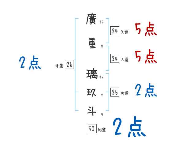 天運![]() | 廣重璃玖斗さんの天運は24画の5つ星!家庭運が良く順調な人生。金運にも恵まれる。 家系が持つ宿命的な運勢を表します。祖先から受け継いだ苗字ですので自分の力が及びません。家柄を象徴します。 |