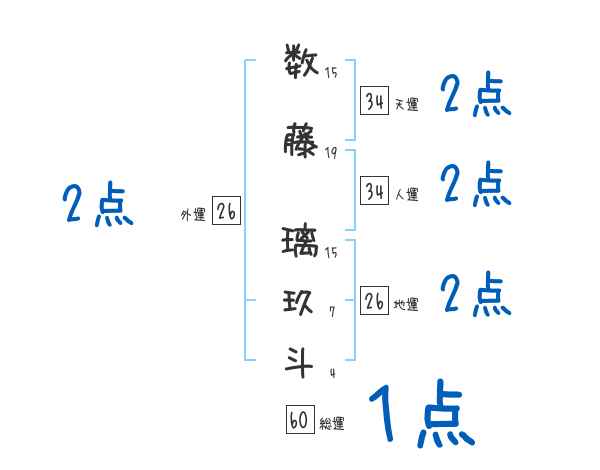 外運![]() | 数藤璃玖斗さんの外運は26画の2つ星!波瀾万丈かも。信頼できる人を大事にしましょう。 生活面を象徴する運勢です。外部から受ける影響力を表し、結婚運、家庭運や職場、環境への順応性を表します。 |