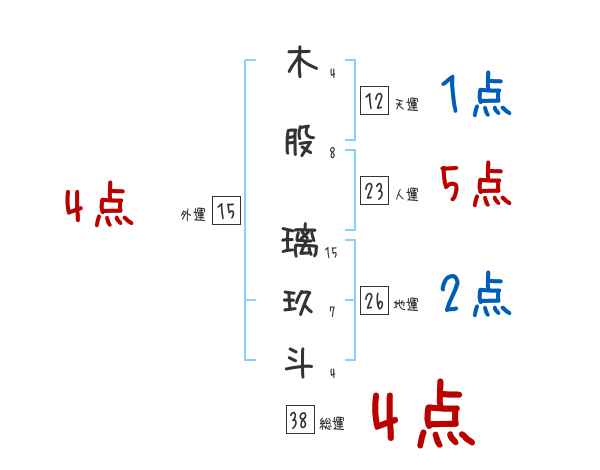 外運![]() | 木股璃玖斗さんの外運は15画の4つ星!人徳があり出世する。順調に物事を進め円満な人生。 生活面を象徴する運勢です。外部から受ける影響力を表し、結婚運、家庭運や職場、環境への順応性を表します。 |