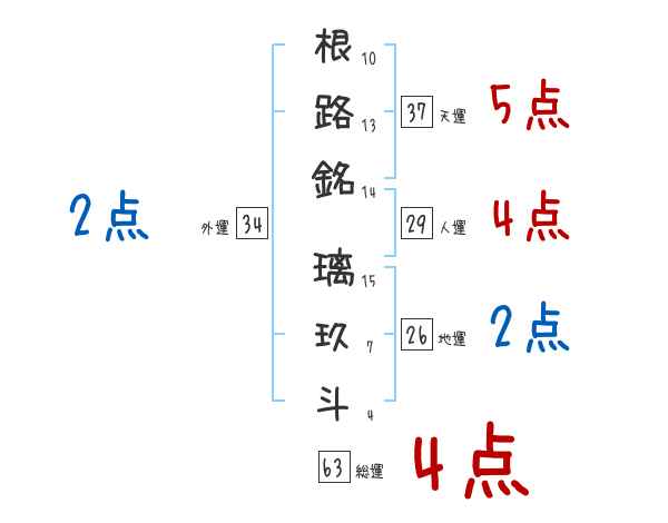 総運![]() | 根路銘璃玖斗さんの総運は63画の4つ星!家庭運がよく順調な生活。温和な性格。 あなたの人生を表す1番重要な運勢です。生涯を通じて影響する総合運となり、主に50歳以降の晩年期に影響を及ぼします。 |