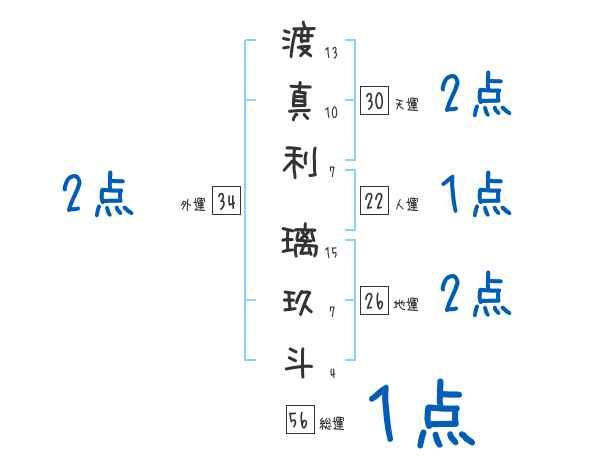 天運![]() | 渡真利璃玖斗さんの天運は30画の2つ星!浮き沈みの激しさに注意しましょう。 家系が持つ宿命的な運勢を表します。祖先から受け継いだ苗字ですので自分の力が及びません。家柄を象徴します。 |