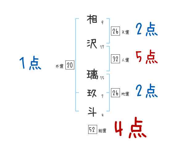 | 総運  | 相沢璃玖斗さんの総運は52画の4つ星!先見性と独創性に優れ考える力がある。強運の持ち主。あなたの人生を表す1番重要な運勢です。生涯を通じて影響する総合運となり、主に50歳以降の晩年期に影響を及ぼします。 |