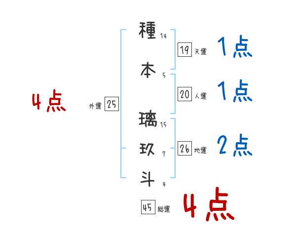 天運![]() | 種本璃玖斗さんの天運は19画の1つ星!優れた才能を持ちますが、協調性が足りないことも。周りの人と協力する事を意識しましょう。 家系が持つ宿命的な運勢を表します。祖先から受け継いだ苗字ですので自分の力が及びません。家柄を象徴します。 |