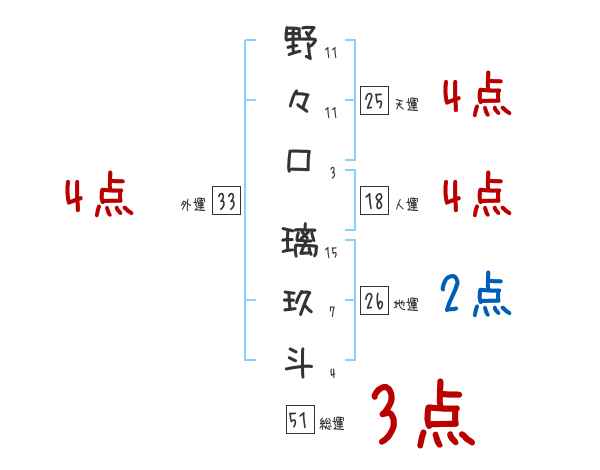天運![]() | 野々口璃玖斗さんの天運は25画の4つ星!個性があり才能があふれる。強運の持ち主で発展する。 家系が持つ宿命的な運勢を表します。祖先から受け継いだ苗字ですので自分の力が及びません。家柄を象徴します。 |