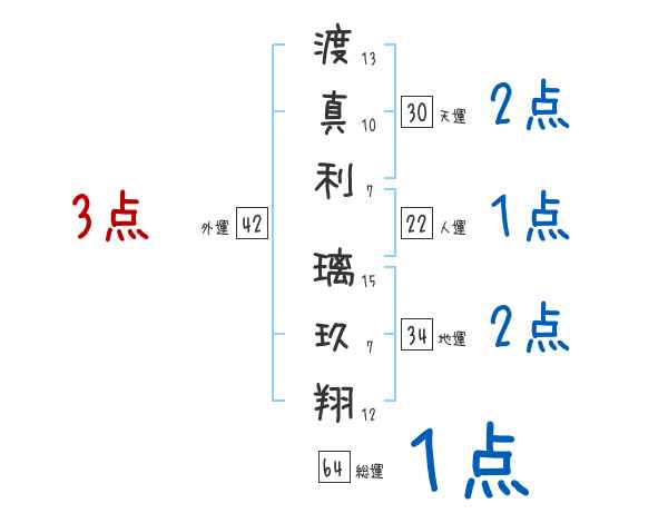 地運![]() | 渡真利璃玖翔さんの地運は34画の2つ星!独創性に優れるが、自尊心が強く災難に注意しましょう。 個性を表す基礎的な運勢です。性格形成や対人関係、行動力など家庭環境に影響されます。主に誕生してから20歳くらいまでの若年期の運勢を表します。 |
