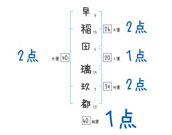 天運![]() | 早稲田璃玖都さんの天運は26画の2つ星!波瀾万丈かも。信頼できる人を大事にしましょう。 家系が持つ宿命的な運勢を表します。祖先から受け継いだ苗字ですので自分の力が及びません。家柄を象徴します。 |