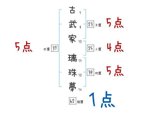 天運![]() | 古武家璃珠夢さんの天運は23画の5つ星!想像力に優れ活力がある。一代で成功し名誉を手に入れる。 家系が持つ宿命的な運勢を表します。祖先から受け継いだ苗字ですので自分の力が及びません。家柄を象徴します。 |