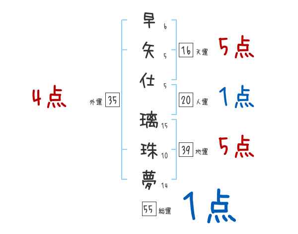 天運![]() | 早矢仕璃珠夢さんの天運は16画の5つ星!人望が厚く大きく発展する。逆転成功が見える。 家系が持つ宿命的な運勢を表します。祖先から受け継いだ苗字ですので自分の力が及びません。家柄を象徴します。 |