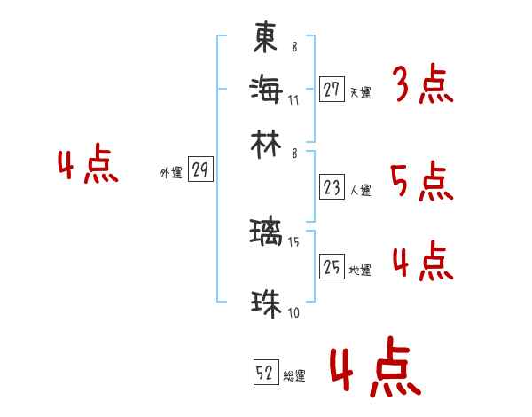 人運![]() | 東海林璃珠さんの人運は23画の5つ星!想像力に優れ活力がある。一代で成功し名誉を手に入れる。 性格や才能などを表す2番目に重要な運勢です。人間関係や協調性、社会的な成功に影響します。主に20歳から50歳ぐらいまでの中年期の運勢を表します。 |