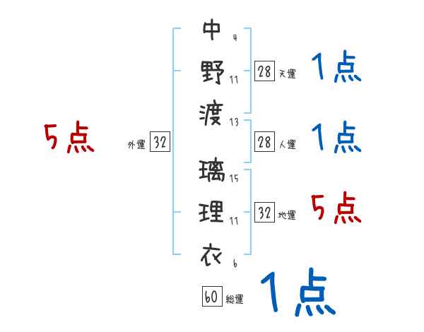 外運![]() | 中野渡璃理衣さんの外運は32画の5つ星!柔軟性があり成功する。チャンスが多く金運が良い。 生活面を象徴する運勢です。外部から受ける影響力を表し、結婚運、家庭運や職場、環境への順応性を表します。 |