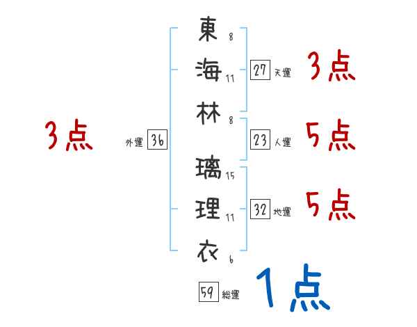 人運![]() | 東海林璃理衣さんの人運は23画の5つ星!想像力に優れ活力がある。一代で成功し名誉を手に入れる。 性格や才能などを表す2番目に重要な運勢です。人間関係や協調性、社会的な成功に影響します。主に20歳から50歳ぐらいまでの中年期の運勢を表します。 |