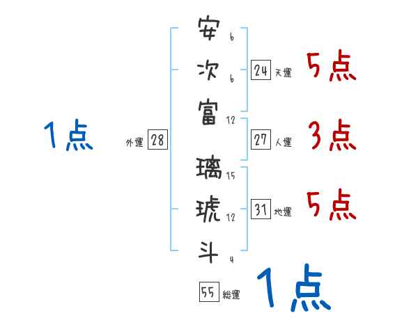 天運![]() | 安次富璃琥斗さんの天運は24画の5つ星!家庭運が良く順調な人生。金運にも恵まれる。 家系が持つ宿命的な運勢を表します。祖先から受け継いだ苗字ですので自分の力が及びません。家柄を象徴します。 |
