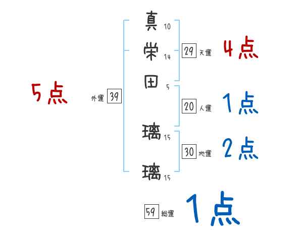 天運![]() | 真栄田璃璃さんの天運は29画の4つ星!完全主義で才能がある。厳格な心の持ち主。 家系が持つ宿命的な運勢を表します。祖先から受け継いだ苗字ですので自分の力が及びません。家柄を象徴します。 |