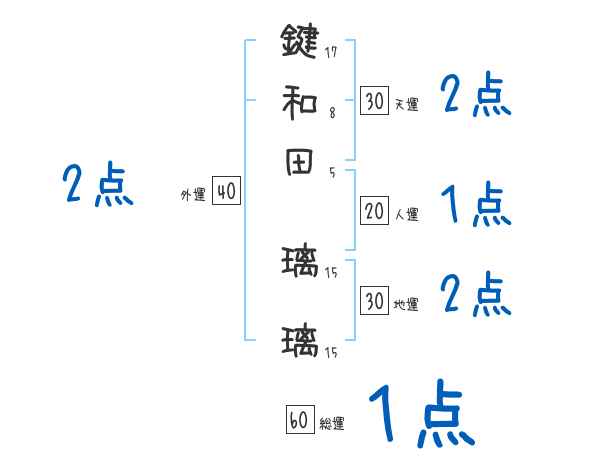 天運![]() | 鍵和田璃璃さんの天運は30画の2つ星!浮き沈みの激しさに注意しましょう。 家系が持つ宿命的な運勢を表します。祖先から受け継いだ苗字ですので自分の力が及びません。家柄を象徴します。 |