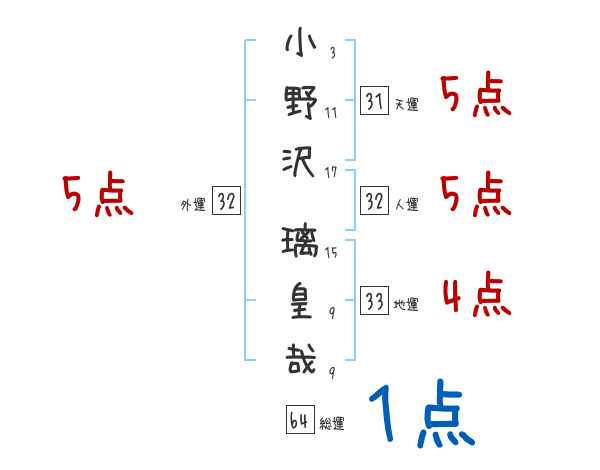 外運![]() | 小野沢璃皇哉さんの外運は32画の5つ星!柔軟性があり成功する。チャンスが多く金運が良い。 生活面を象徴する運勢です。外部から受ける影響力を表し、結婚運、家庭運や職場、環境への順応性を表します。 |