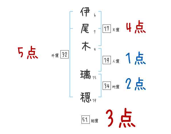 外運![]() | 伊尾木璃穏さんの外運は32画の5つ星!柔軟性があり成功する。チャンスが多く金運が良い。 生活面を象徴する運勢です。外部から受ける影響力を表し、結婚運、家庭運や職場、環境への順応性を表します。 |