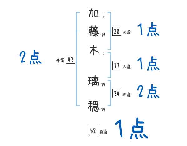 天運![]() | 加藤木璃穏さんの天運は28画の1つ星!家庭環境に注意。スポーツで活躍できる能力があるかも。 家系が持つ宿命的な運勢を表します。祖先から受け継いだ苗字ですので自分の力が及びません。家柄を象徴します。 |