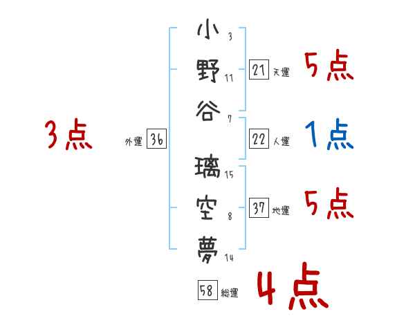 天運![]() | 小野谷璃空夢さんの天運は21画の5つ星!統率力がある。独立し成功する。名誉を手に入れる。 家系が持つ宿命的な運勢を表します。祖先から受け継いだ苗字ですので自分の力が及びません。家柄を象徴します。 |