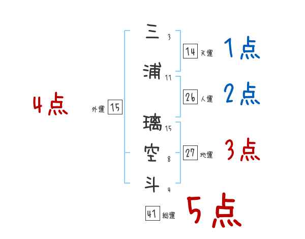 外運![]() | 三浦璃空斗さんの外運は15画の4つ星!人徳があり出世する。順調に物事を進め円満な人生。 生活面を象徴する運勢です。外部から受ける影響力を表し、結婚運、家庭運や職場、環境への順応性を表します。 |