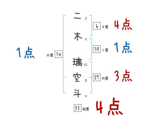 外運![]() | 二木璃空斗さんの外運は14画の1つ星!人に対して優しいがストレスを溜め込みがち。人間関係のトラブルを避けるよう気をつけましょう。 生活面を象徴する運勢です。外部から受ける影響力を表し、結婚運、家庭運や職場、環境への順応性を表します。 |