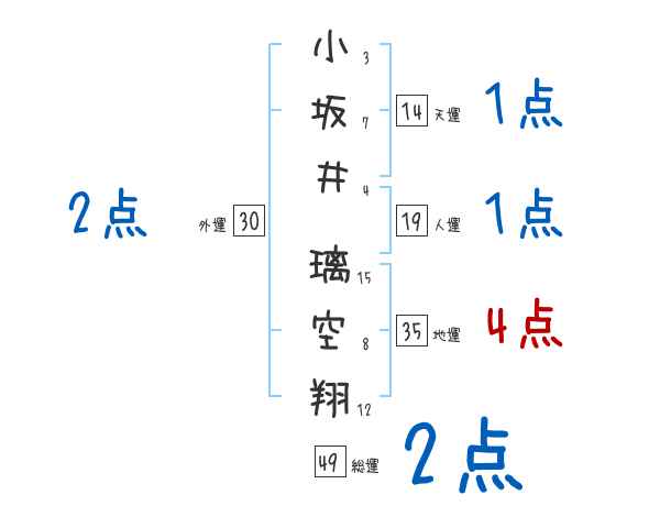 総運![]() | 小坂井璃空翔さんの総運は49画の2つ星!不安定な性格で明暗がある人生。周りの人には支援されやすい。 あなたの人生を表す1番重要な運勢です。生涯を通じて影響する総合運となり、主に50歳以降の晩年期に影響を及ぼします。 |