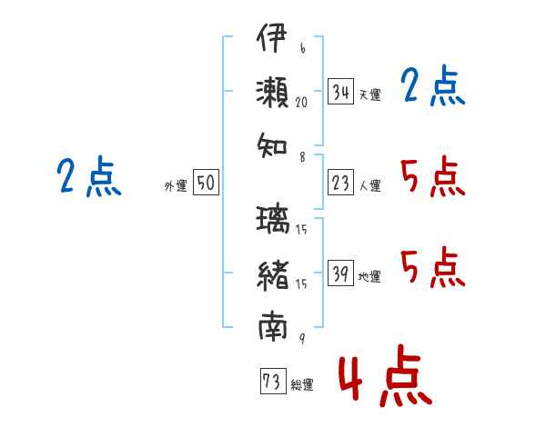 総運![]() | 伊瀬知璃緒南さんの総運は73画の4つ星!天徳のある人生。散財に注意すれば晩年幸福。 あなたの人生を表す1番重要な運勢です。生涯を通じて影響する総合運となり、主に50歳以降の晩年期に影響を及ぼします。 |