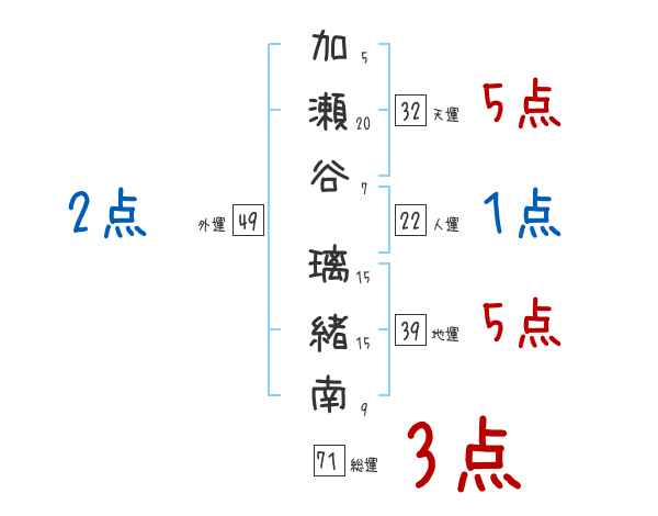 天運![]() | 加瀬谷璃緒南さんの天運は32画の5つ星!柔軟性があり成功する。チャンスが多く金運が良い。 家系が持つ宿命的な運勢を表します。祖先から受け継いだ苗字ですので自分の力が及びません。家柄を象徴します。 |