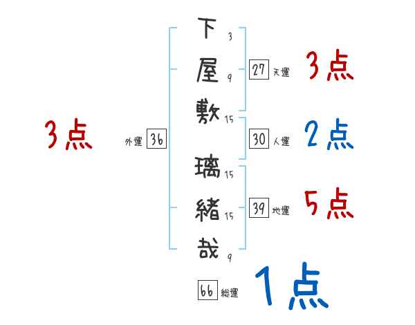 下屋敷璃緒哉さんの外運は36画の3つ星