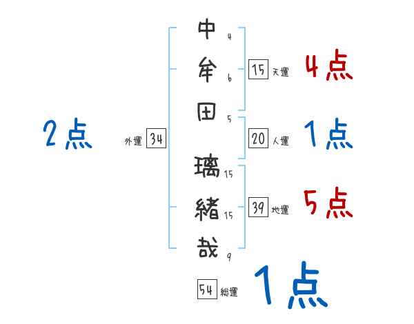 総運![]() | 中牟田璃緒哉さんの総運は54画の1つ星!トラブルが多いかも。周りをよく見て協調して過ごしましょう。 あなたの人生を表す1番重要な運勢です。生涯を通じて影響する総合運となり、主に50歳以降の晩年期に影響を及ぼします。 |