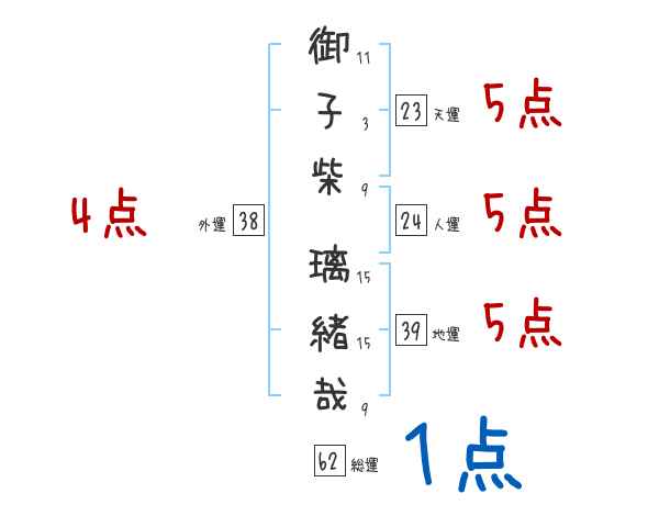 天運![]() | 御子柴璃緒哉さんの天運は23画の5つ星!想像力に優れ活力がある。一代で成功し名誉を手に入れる。 家系が持つ宿命的な運勢を表します。祖先から受け継いだ苗字ですので自分の力が及びません。家柄を象徴します。 |