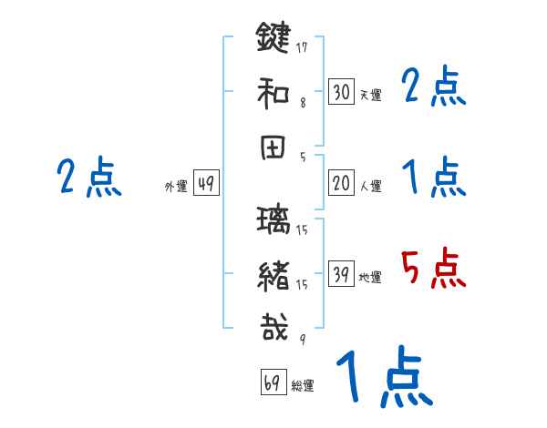 総運![]() | 鍵和田璃緒哉さんの総運は69画の1つ星!不満を感じやすい傾向が。ストレスを貯めないように注意しましょう。 あなたの人生を表す1番重要な運勢です。生涯を通じて影響する総合運となり、主に50歳以降の晩年期に影響を及ぼします。 |