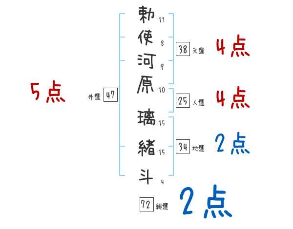 総運![]() | 勅使河原璃緒斗さんの総運は72画の2つ星!災難が多く不安定な生活にならないように注意。明暗のある人生かも。 あなたの人生を表す1番重要な運勢です。生涯を通じて影響する総合運となり、主に50歳以降の晩年期に影響を及ぼします。 |