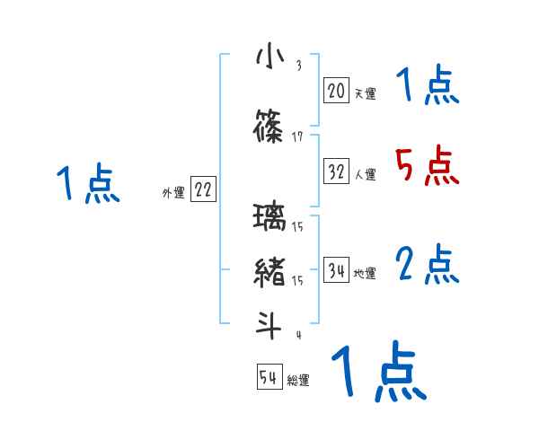人運![]() | 小篠璃緒斗さんの人運は32画の5つ星!柔軟性があり成功する。チャンスが多く金運が良い。 性格や才能などを表す2番目に重要な運勢です。人間関係や協調性、社会的な成功に影響します。主に20歳から50歳ぐらいまでの中年期の運勢を表します。 |