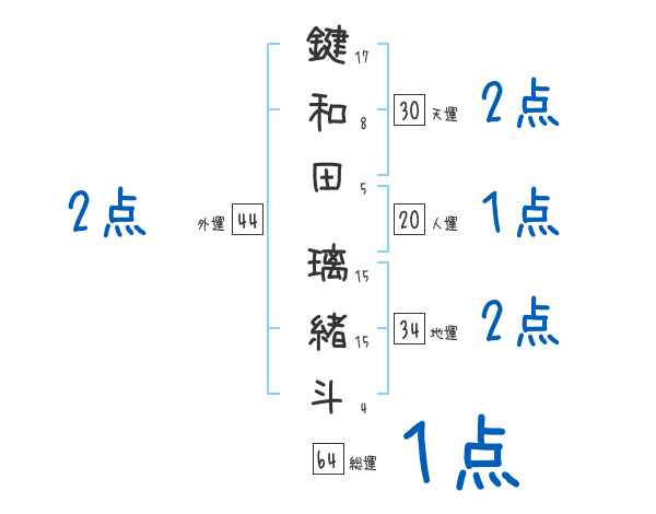 外運![]() | 鍵和田璃緒斗さんの外運は44画の2つ星!誠実で慎重な性格。物事を考えすぎないように注意しましょう。 生活面を象徴する運勢です。外部から受ける影響力を表し、結婚運、家庭運や職場、環境への順応性を表します。 |