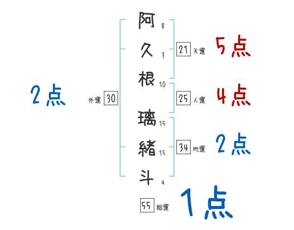 天運![]() | 阿久根璃緒斗さんの天運は21画の5つ星!統率力がある。独立し成功する。名誉を手に入れる。 家系が持つ宿命的な運勢を表します。祖先から受け継いだ苗字ですので自分の力が及びません。家柄を象徴します。 |