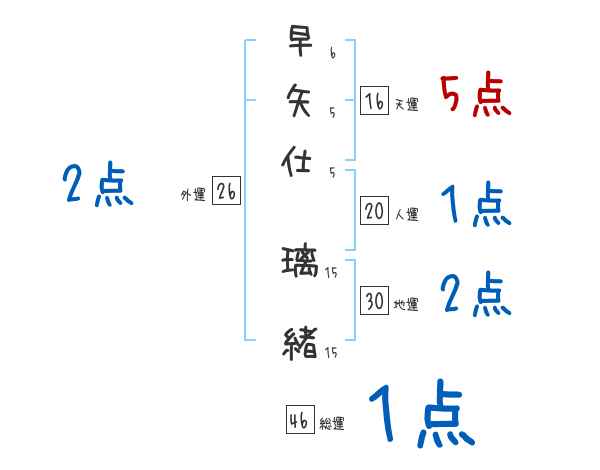 天運![]() | 早矢仕璃緒さんの天運は16画の5つ星!人望が厚く大きく発展する。逆転成功が見える。 家系が持つ宿命的な運勢を表します。祖先から受け継いだ苗字ですので自分の力が及びません。家柄を象徴します。 |