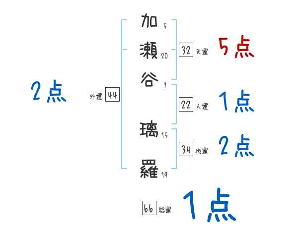 天運![]() | 加瀬谷璃羅さんの天運は32画の5つ星!柔軟性があり成功する。チャンスが多く金運が良い。 家系が持つ宿命的な運勢を表します。祖先から受け継いだ苗字ですので自分の力が及びません。家柄を象徴します。 |