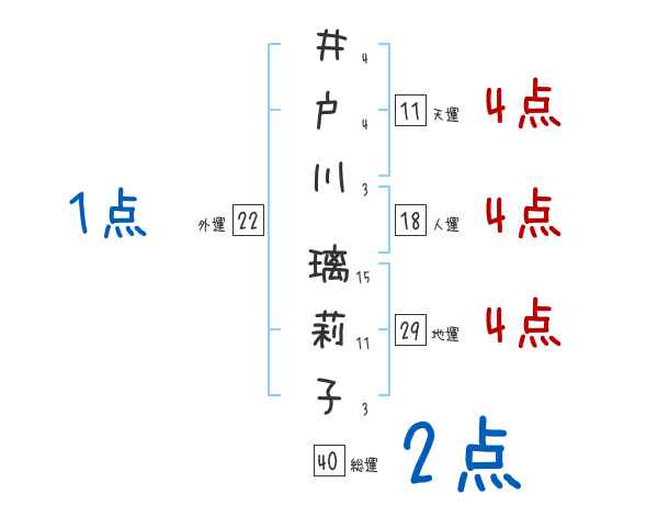 天運![]() | 井戸川璃莉子さんの天運は11画の4つ星!着実に富や地位を得る幸運な人生。 家系が持つ宿命的な運勢を表します。祖先から受け継いだ苗字ですので自分の力が及びません。家柄を象徴します。 |