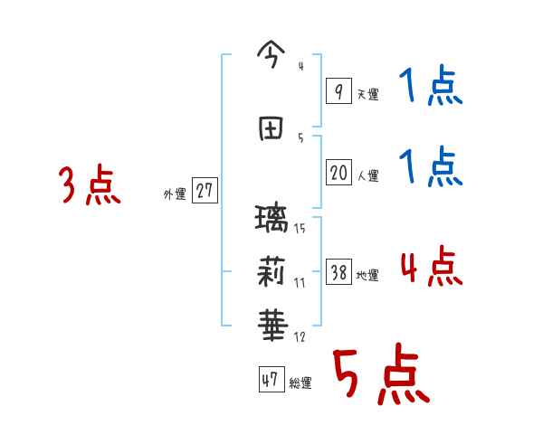 総運![]() | 今田璃莉華さんの総運は47画の5つ星!実力が開花し発展する円満な人生。財に恵まれる。 あなたの人生を表す1番重要な運勢です。生涯を通じて影響する総合運となり、主に50歳以降の晩年期に影響を及ぼします。 |