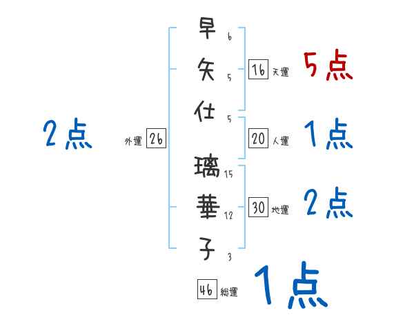 外運![]() | 早矢仕璃華子さんの外運は26画の2つ星!波瀾万丈かも。信頼できる人を大事にしましょう。 生活面を象徴する運勢です。外部から受ける影響力を表し、結婚運、家庭運や職場、環境への順応性を表します。 |