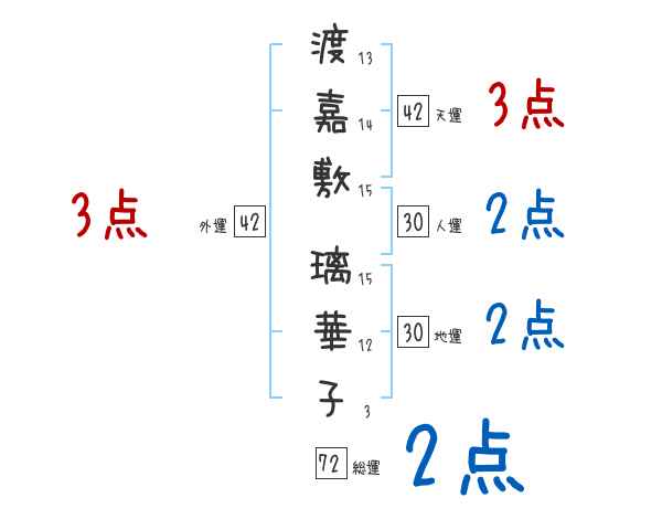 総運![]() | 渡嘉敷璃華子さんの総運は72画の2つ星!災難が多く不安定な生活にならないように注意。明暗のある人生かも。 あなたの人生を表す1番重要な運勢です。生涯を通じて影響する総合運となり、主に50歳以降の晩年期に影響を及ぼします。 |