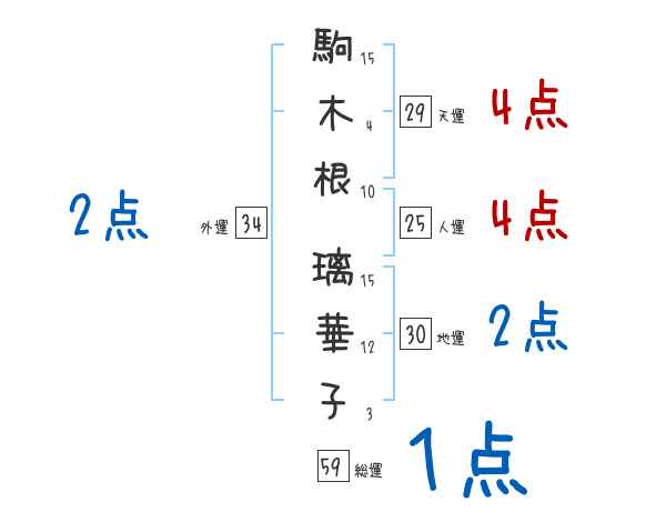 天運![]() | 駒木根璃華子さんの天運は29画の4つ星!完全主義で才能がある。厳格な心の持ち主。 家系が持つ宿命的な運勢を表します。祖先から受け継いだ苗字ですので自分の力が及びません。家柄を象徴します。 |