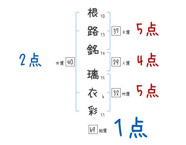 総運![]() | 根路銘璃衣彩さんの総運は69画の1つ星!不満を感じやすい傾向が。ストレスを貯めないように注意しましょう。 あなたの人生を表す1番重要な運勢です。生涯を通じて影響する総合運となり、主に50歳以降の晩年期に影響を及ぼします。 |