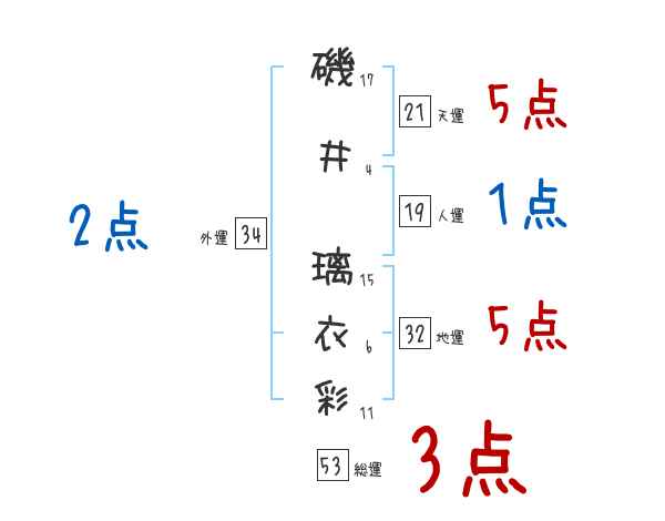 天運![]() | 磯井璃衣彩さんの天運は21画の5つ星!統率力がある。独立し成功する。名誉を手に入れる。 家系が持つ宿命的な運勢を表します。祖先から受け継いだ苗字ですので自分の力が及びません。家柄を象徴します。 |