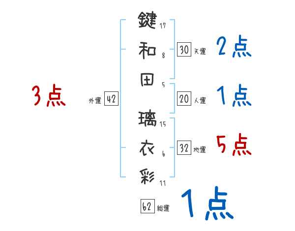 地運![]() | 鍵和田璃衣彩さんの地運は32画の5つ星!柔軟性があり成功する。チャンスが多く金運が良い。 個性を表す基礎的な運勢です。性格形成や対人関係、行動力など家庭環境に影響されます。主に誕生してから20歳くらいまでの若年期の運勢を表します。 |